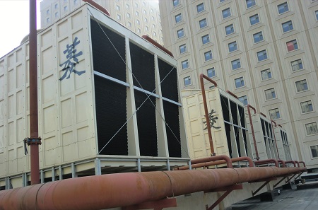 广州新菱(佛冈)空调冷冻设备有限公司生产的,横流式玻璃钢冷却塔型号:SC-450H  ,循环水量450 m³/h;风机直径:3048mm;冷却塔尺寸:5900×4020×4916 mm;SiNRO新菱冷却塔专用电机:型号:YLZC180L-6N2;功率15Kw;转速970 r/min;重量185 kg;噪声值:78dB(A);