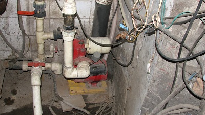 龙腾浴池位于铁西区贵和街,执行城市区域环境噪声二类区域标准。浴池供水采取水源热泵技术,机房安装3台爱达电器AD818、AD308型水源热泵和浴池专用热泵热水器,3台自吸泵、2台管道泵、3台潜水泵。机组运行时机房内噪声级为72dB(A),机房门外1m处为60dB(A),机房楼上二楼居民室内噪声为57 dB(A),对楼上居民造成强烈的噪声干扰,因此要求治理。