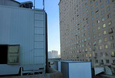 声源南、西二面为居民楼,相距约30米,该型号冷却塔工作时出风口A声级为81dB(A),进风口A声级71 dB(A)。冷却塔座落在楼顶,除了贡献一次噪声外,还有明显的振动。